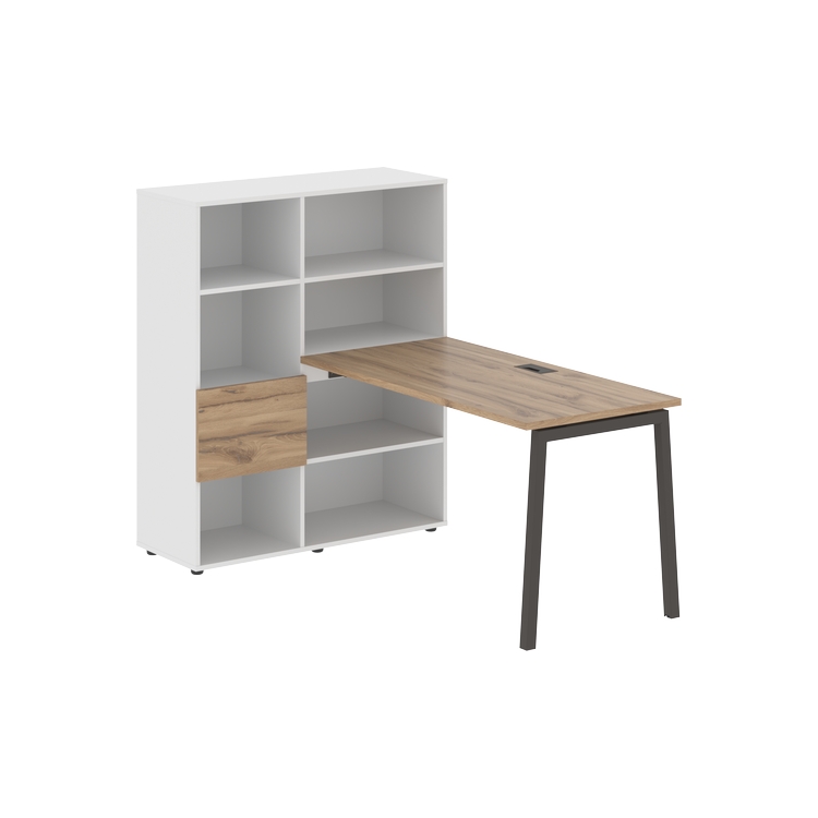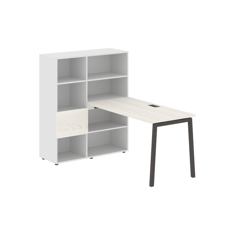 Каркасы стеллажей полностью из ЛДСП т.18 мм с кромками ПВХ т.2 и 0,45 мм, задняя стенка из ЛДСП. Комплектуется малой дверью в цвет столешницы и регулируемыми опорами h= 27 мм.